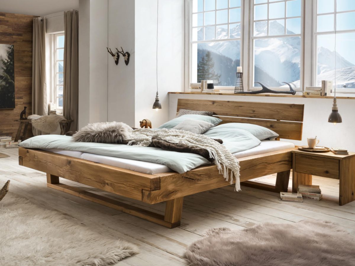 Dieses aussergewöhnliche Balkenbett besticht durch seinen naturbelassenen Look und handwerklicher Kunst. Die Schwebe-Holzkufe unterstreicht das handwerkliche Design. Erhältlich in 180/200 und 160/200 cm . Passende Nachttische erhältlich. Alle Artikel ab Lager sofort verfügbar. Solange Vorrat reicht.