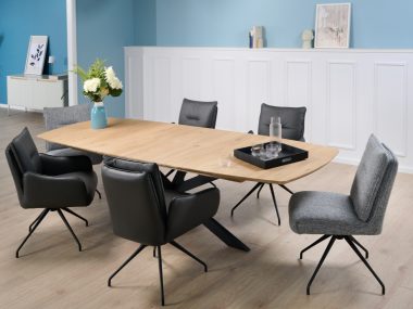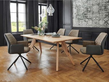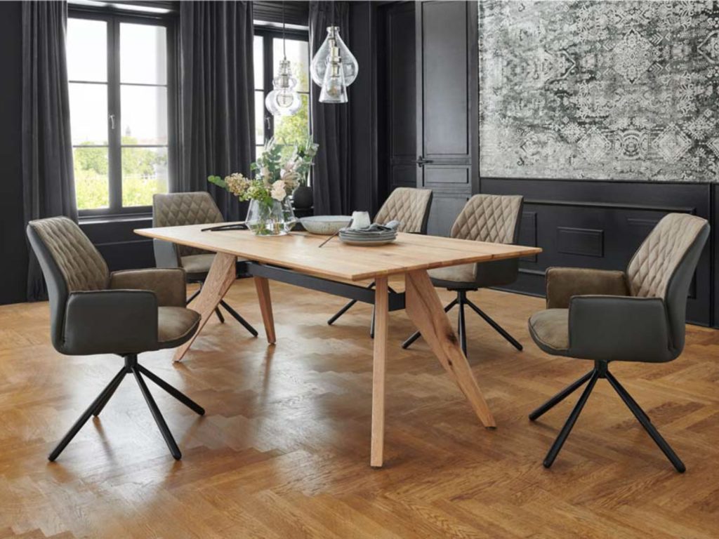 Eiche massiv in 10 verschiedenen Beizfarben erhältlich. Gestell in Metall schwarz. Breite ca. 100 cm, Länge ca. 160/180/200 cm mit einer Klappeinlage um 50 cm verlängerbar. Gezeigte Komb. CHF 2990.-