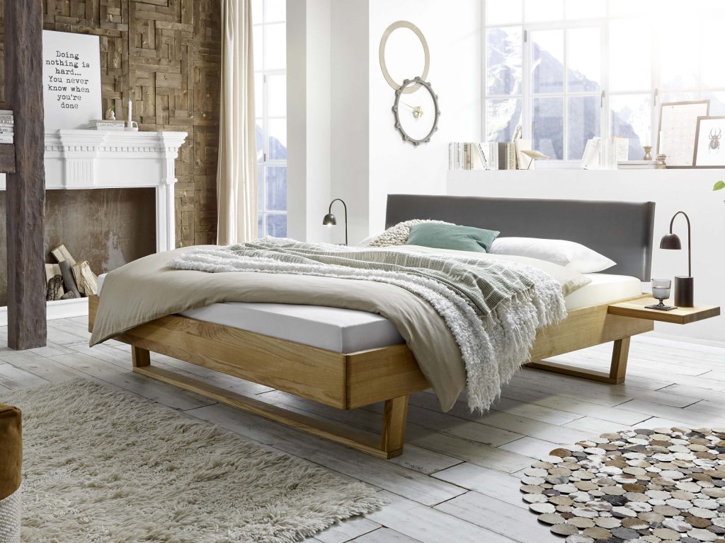 Dieses besondere Bett in massiver Wildeiche und einem komfortablen Polsterkopfteil mit einer wunderschönen Holzkufe ist erhältlich in 180/200 und 160/200 cm . Passende Nachttischablage erhältlich. Alle Artikel ab Lager sofort verfügbar.