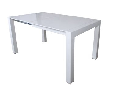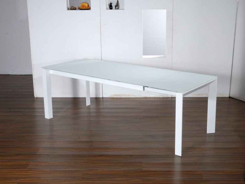 Mit einer Glasplatte in weiss sandgestrahlt und weiss matt lackierten Aluminium Füssen. Dieser Tisch ist von 180/90 cm mit einer Einlage von 50 cm vergrösserbar. Auch erhältlich in 160/90 cm. Gezeigte Komb. CHF 1220.-. Beide Grössen ab Lager sofort verfügbar.