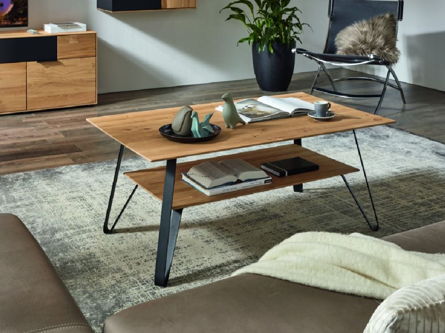 Hochwertige Platte aus Wildeiche massiv, soft gebürstet, mit Natur-Effekt-Lack. Gestell aus Metall, pulverbeschichtet Carbon-farbig. Die Höhe ist 43 cm und Sie können aus den Grössen 95 x 65 cm oder 120 x 70 cm wählen.